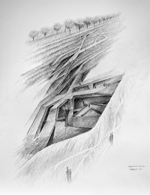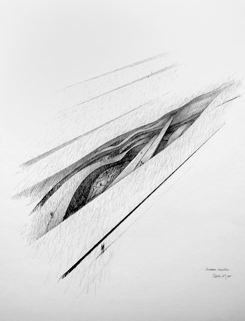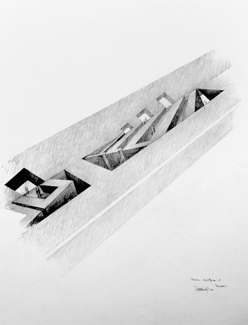 • de faire vivre l’Architecture oblique sous forme de dessins qui s’imposent rapidement comme des œuvres en soi, publiées sous forme de recueils (Vivre à l’oblique en 1970, Entrelacs de l’oblique en 1981, Colères en 1982) ou exposées ;